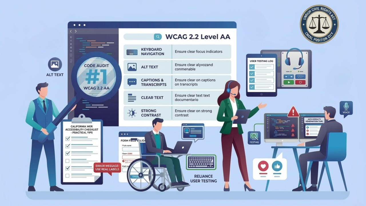 California businesses should take this seriously. State accessibility pages point to WCAG 2.2 Level AA, the ADA, and the Unruh Civil Rights Act. Inclusive Web’s California page also notes that businesses in California can face ADA and Unruh Act claims if websites are not accessible.